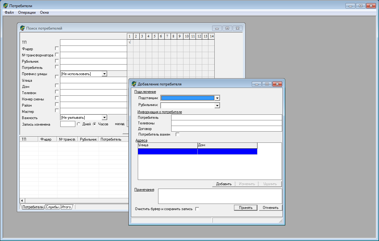 Ещё одна программа для Горэлектросети, выполняет поиск потребителей электроэнергии для информирования их о плановых работах на подстанциях. Написана на Delphi, SQL сервер Interbase используется для хранения данных, клиентский код получает доступ к функциям Interbase с помощью библиотеки IBAccess. Более поздняя версия этой программы была объединена с программой «Построения чертежей трансформаторных подстанций».