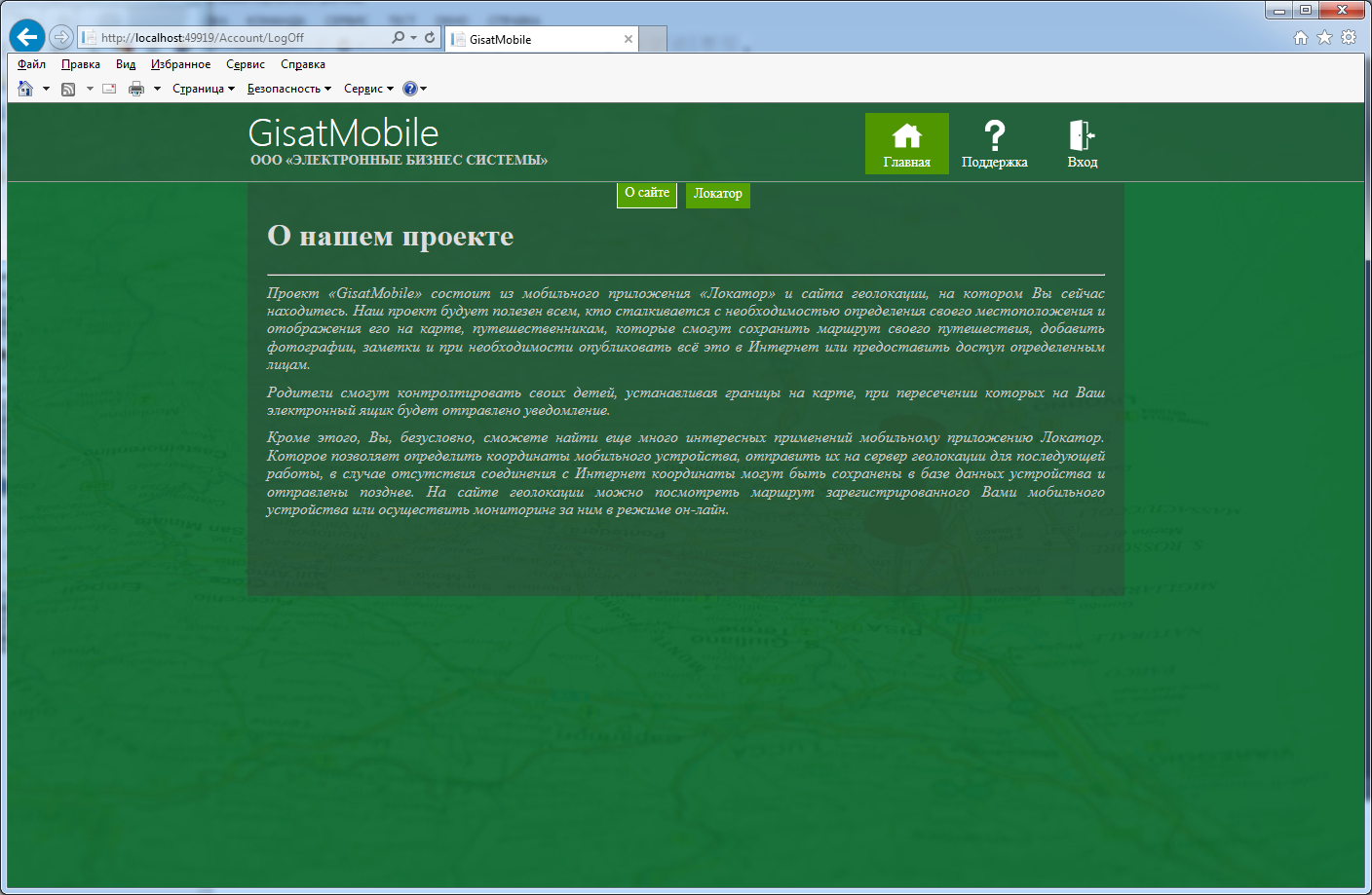В 2015 году компания ООО «ЭЛЕКТРОННЫЕ БИЗНЕС СИСТЕМЫ» запустила первую версию своего геоинформационного ресурса, позволяющего узнать проделанный маршрут и географическое положение электронного устройства на котором установленно специальное программное обеспечением. Ресурс предназначается как физическим лицам так различным компаниям. В качестве устройств могут выступать сотовые телефоны под управлением Windows Phone и Andriod, а также более специализированные устройства, передающие кроме географического местоположения и другую информацию. Я принимал участие в разработке некоторых протоколов обмена между серовером и мобильными устройствами, реализации всего серверного кода и клиентской части для Web браузеров. В январе 2016 года я завершил работу над новой версии этого сайта, был изменен дизайн, серверная часть переписана под технологию C# MVC, подготовлен протокол перевода на другие языки, изменен протокол обмена с мобильными устройствами, которые теперь могут передавать фотографии.